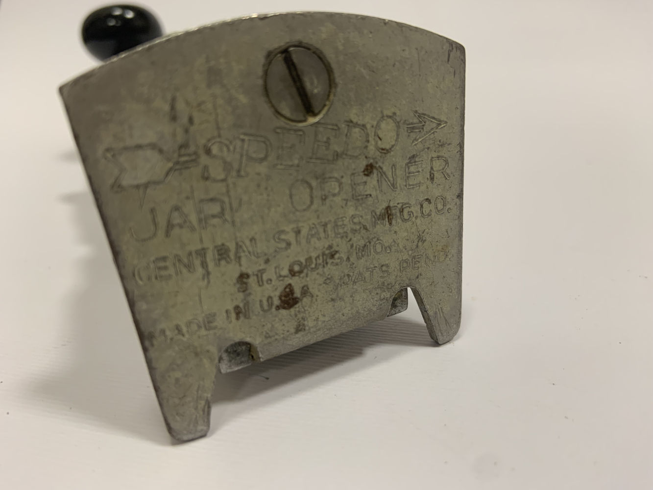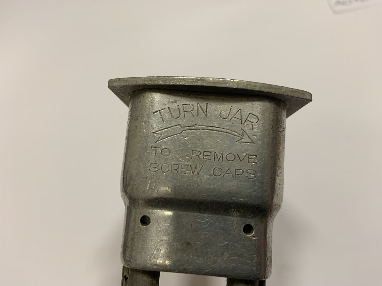 Apribarattolo in metallo. Costituito da due parti simmetriche, una fissa e l’altra scorrevole, gestita da una molla e frenata da una manovella con pomello in legno, regolabile in funzione del coperchio da svitare.