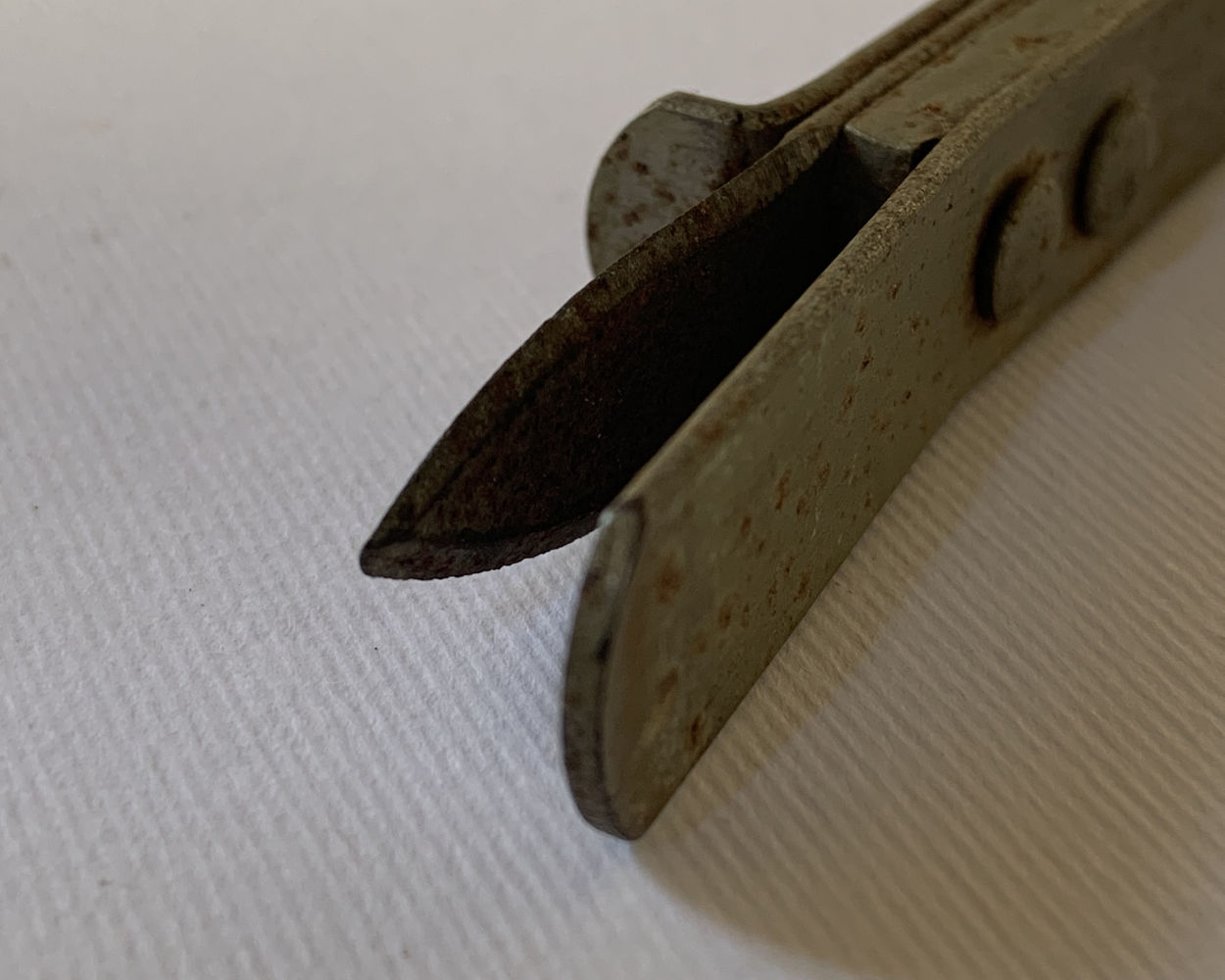 Apriscatole mono manico in ferro a leva con lama da taglio fissa e vincolo. Il manico, costituito da un’unica lastra di ferro ripiegata su sé stessa a formare un’asola, porta nell’estremità una barretta di ferro con funzione di spessore e una lama per effettuare il taglio.