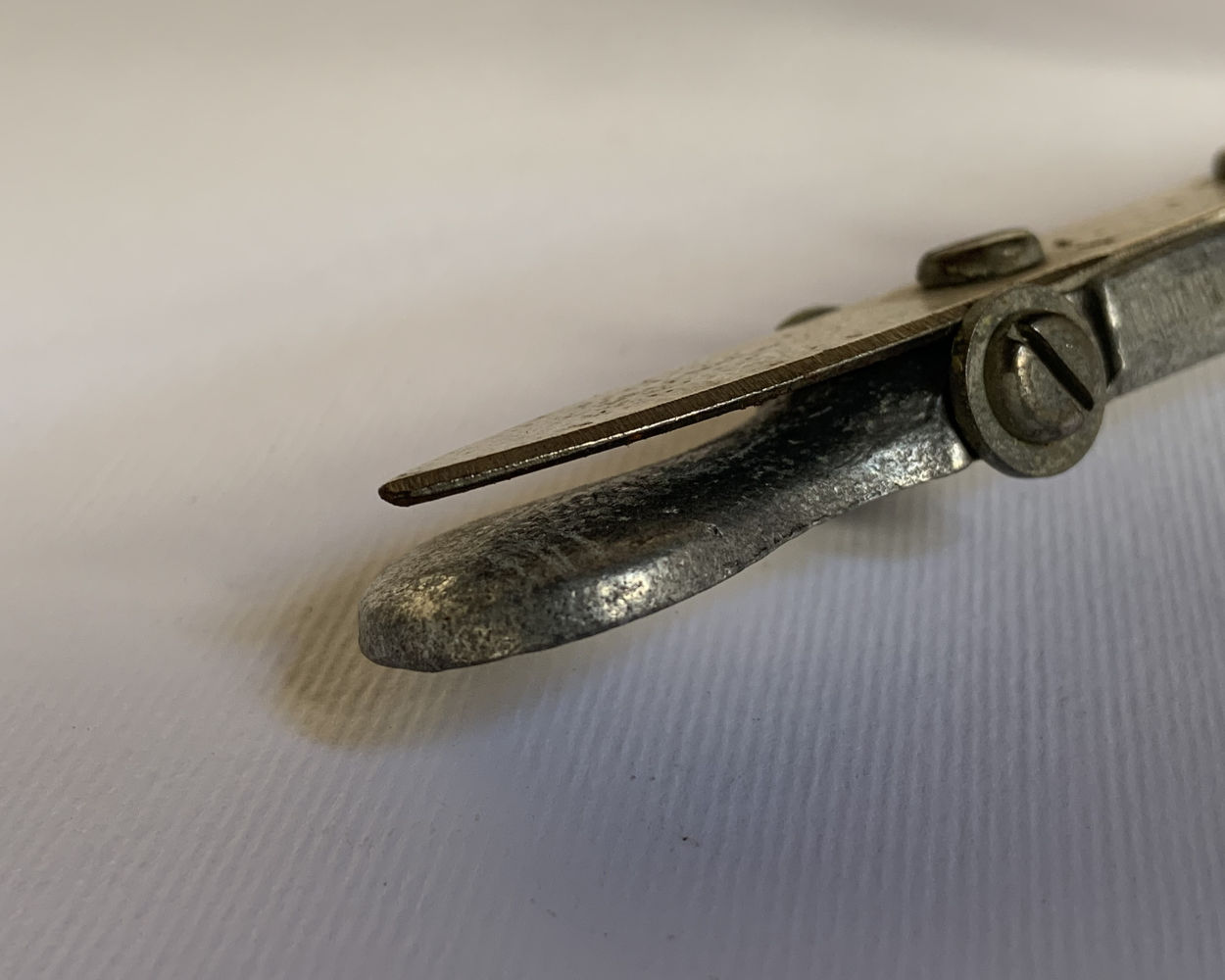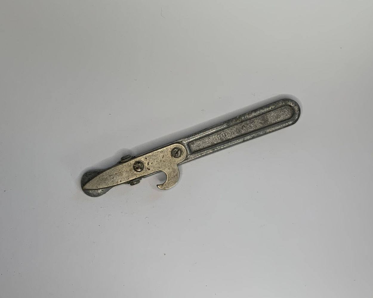 Apriscatole mono manico in ferro a leva con lama da taglio fissa e vincolo. Il manico prosegue parallelo alla lama da taglio e forma con essa una fessura all’interno della quale posizionare il bordo del coperchio della lattina. Dalla parte opposta alla lama il manico ricurvo ad uncino ha funzione di apribottiglie.