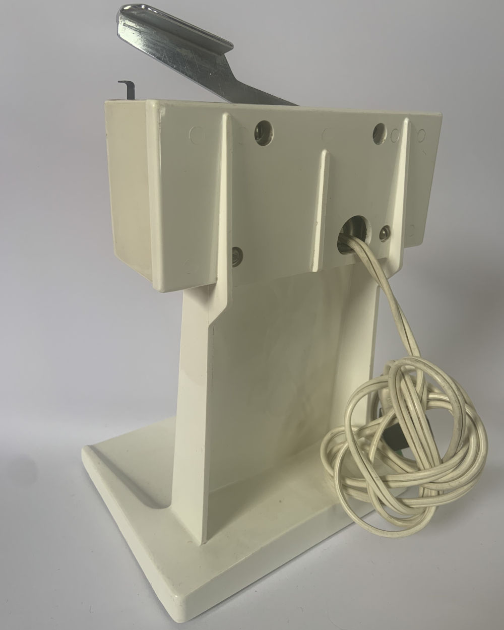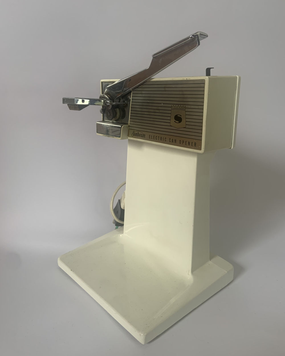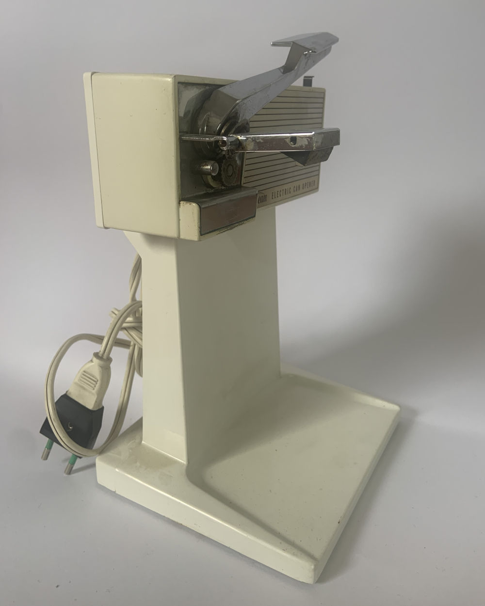 Apriscatole elettrico di colore bianco, con dettagli in metallo. Abbassando la leva, si è in grado di perforare la scatola che si ancorerà alla lama così che non sia necessario trattenerla con la mano durante l’apertura, che avviene tenendo premuto sulla leva. Quando la scatola sarà aperta, diminuendo la pressione sulla leva, l’apparecchio si ferma. Lasciando la manopola si libera la scatola, poi si può rimuovere il coperchio rimasto fissato alla calamita. Lo strumento presenta una calamita per fissare il coperchio della lattina una volta aperta.